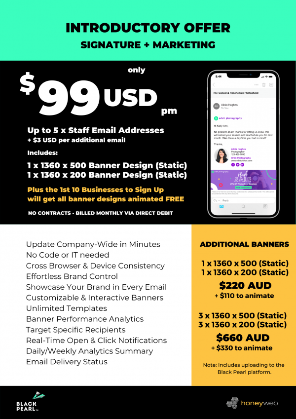 If your email signature isn’t generating business, it’s just wasted space. Black Pearl transforms traditional signatures into a marketing channel with no code or IT needed required. Just beautiful signatures complemented with marketing banners and analytics to make every email more effective.